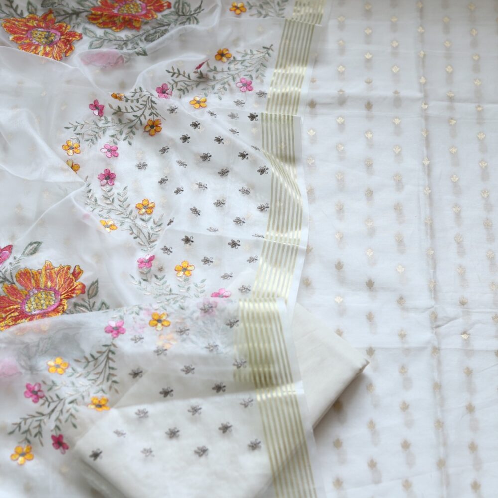 Be the first to review “22.Ivory zari weaved highlight top with organza thread work dupatta-1”