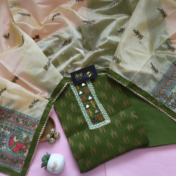 Be the first to review “Grass green cotton top with beige thread high light dupatta set”