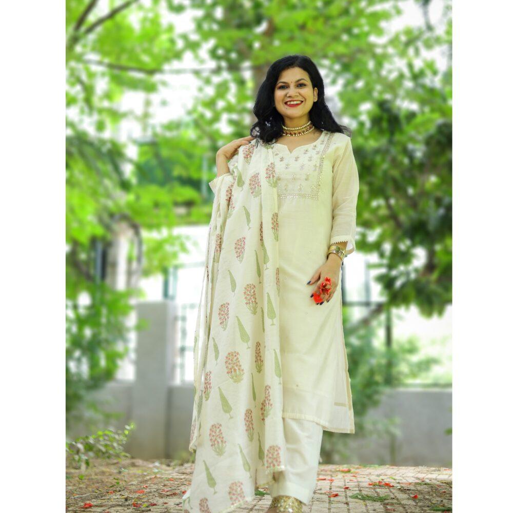 Pearl white chanderi 3 piece with gota neck work and printed dupatta